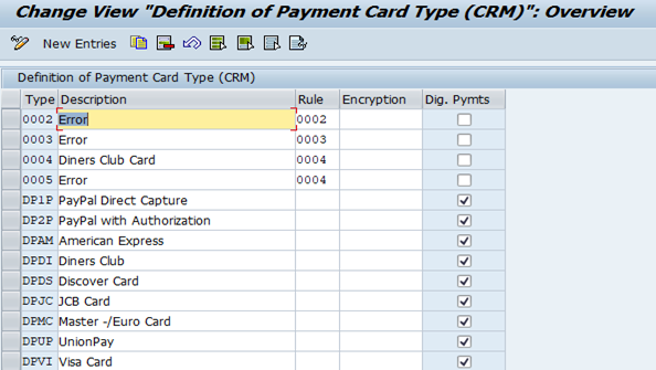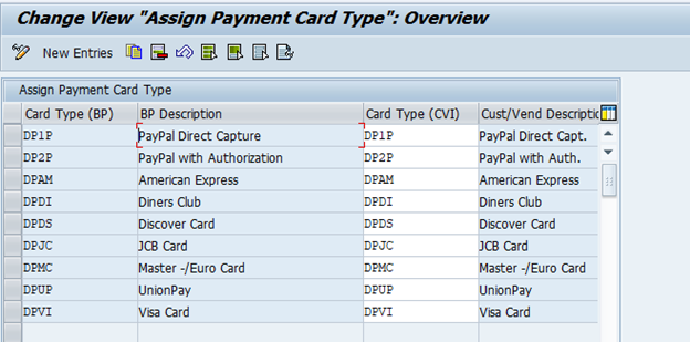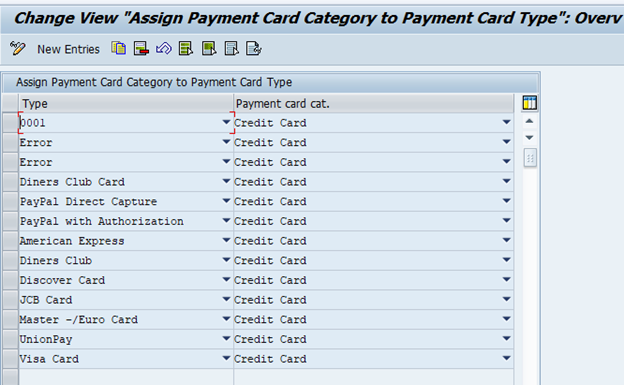 Sales and Distribution → Billing → Payment Cards → Maintain Card Types