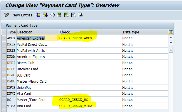 Create new payment card types & assign the defined check rules to the payment card types. Create only one payment card type per credit card institution.
