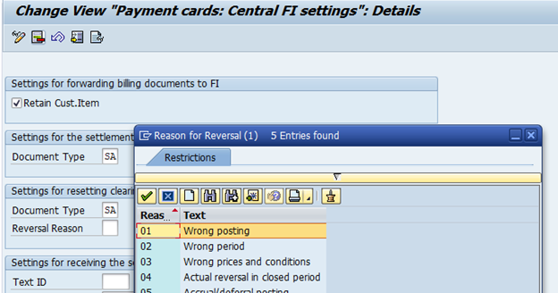 - Here, we specify a document type for resetting cleared items if settlement cannot be made by the payment card company.