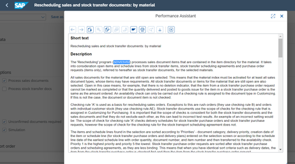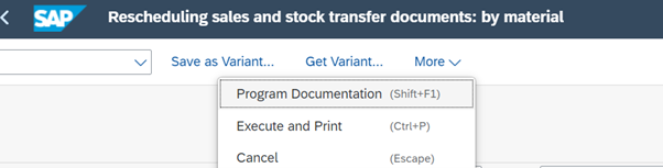 In Fiori, this transaction is app “Rescheduling sales and stock transfer documents by material”. To see the program name, follow the path “More>Program Documentation”, as below.