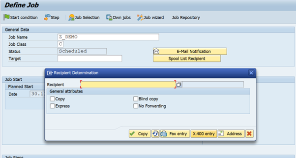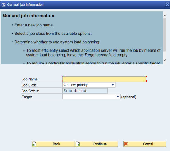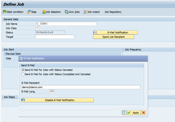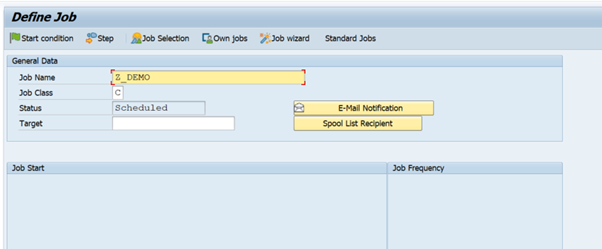 Add a name for your batch job. Normally your organisation will have specific naming conventions which you should follow. I am naming my job “Z_DEMO”.