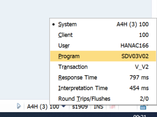 1. The first step is to understand the program name for the report or transaction. You can get to this in the SAP GUI by clicking on the down arrow next to your system ID, as below. For the transaction I am going to use (V_V2), the program name is SDV03V02.