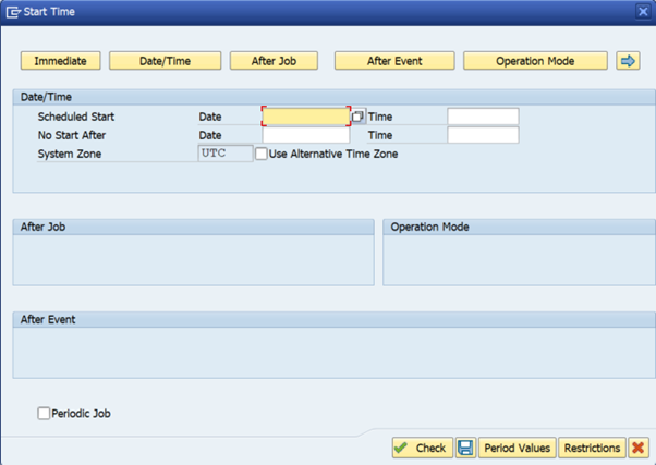 • After event – specify an existing trigger event (event would be defined by your ABAPer) which should trigger your batch job to run.