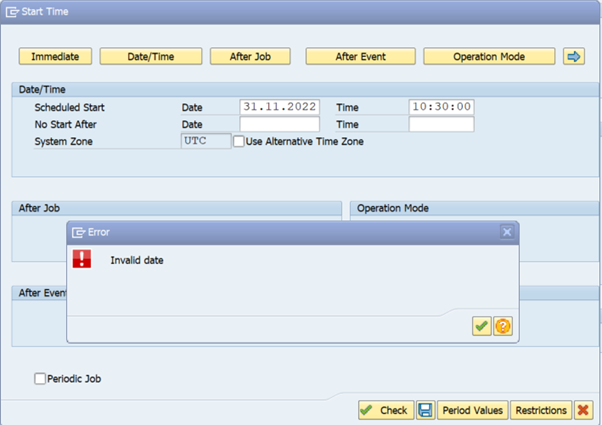 Once you are ready to save the job, ensure you click “Check” to validate all your entries. For example, I have added an invalid date here and clicking “Check” advises me of this.