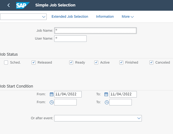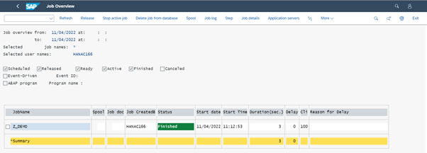 10. From SM37/Simple Job Selection app, you can see the list of jobs created by you, along with the status, start date and time and duration.