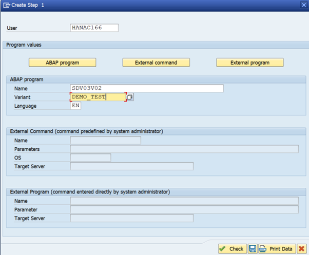 • The username which the step should be run under – this is useful if you are using a background user for your batch job – check with your basis department as the background user will need the correct security authorizations to be able to run the program. The name is defaulted to your own username.