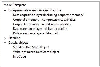 What about objects in the Persistency area? Here the key player is an object called Advanced DataStore, the successor of the old InfoCube, classic DataStore, Hybrid Provider and PSA Table. From the transportation object point of view, it is true that we have only one physical object. But from BW topics, we have several possible options, to decide how our Advanced DSO will work – this is handled by a setting called “model template” definition.
