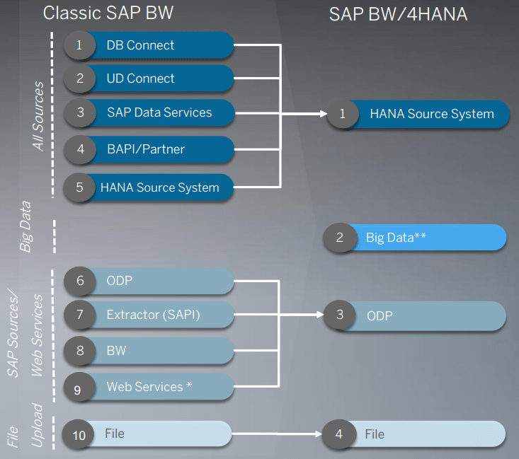 One of the main data warehouse functionalities is the process of collecting data from different sources. Below we can see an overview of the improvements and approaches we have in BW/4HANA: