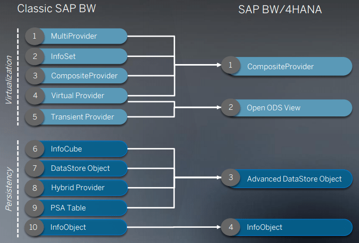 In almost all SAP material about BW/4HANA we find information that BW development will be simplified and sped up because of decreasing the BW object numbers from 10 to 4: