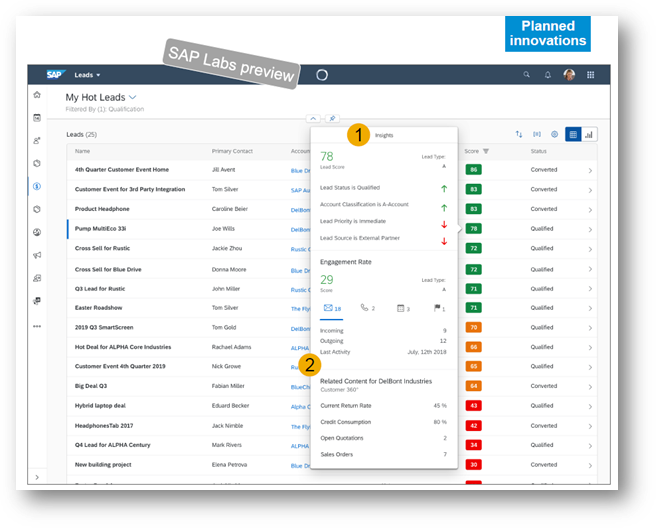 Dynamically Computed Info: Embedded Machine Learning can be made part of the reports and analytics. In the Exhibit - 5 shown below, the Green/Orange/Red scores indicated against each Lead is a dynamically calculated number. The pop-up screen marked bubble “1” and “2” shows the explanation of the score calculation. This avoids time consuming cross-product navigation to find the reasons behind such scorings.