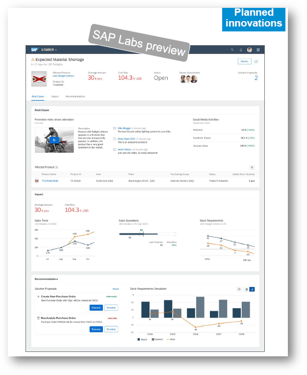 Business Situation Handling: This provides intelligence in the context of a business situation. Let’s look at the example in Exhibit - 6 below. Based on a rule and/or machine learning, a condition situation is identified namely as “Expected Material Shortage”. It also provides the context, namely shortage quantity (30k pieces) and the cost ($104.3k US). It also proposes recommendations with a ranking by preference.