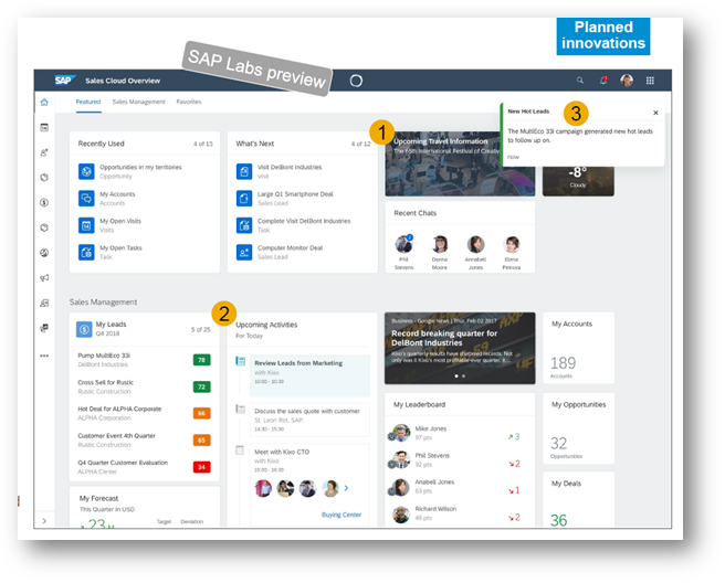 Home Page: Time critical information can be pushed into one of those blocks on the home page -see Bubble marked “1” in the Exhibit-4 below. Cards containing snippets of information and insights can be shown in the home page. See Bubble marked “2” in the Exhibit-4 below. Notifications can be shown on desktops as well as devices such mobile/tablets. See bubble marked “3” in the Exhibit - 4 below: