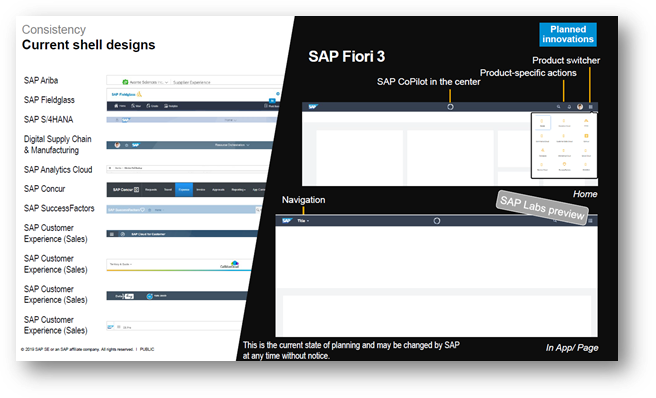Fiori 3 screens will uniformly use the SAP Invented font “72 Font” for consistency across all products. SAP is also working on the typography. For example, should the Delete button be called “Delete” or “Remove” or something else. Similarly, whether “X” should be the symbol to indicate remove items or “trashcan” and so on. The Home Page design was different for different solutions and in the process of bringing uniformity, even this has been harmonized. Also, now to accommodate the possibility of data from different applications to be shown in home page, the modular blocks display them distinctly. SAP CoPilot, the conversational user interface is part of the top band called “shell bar”. A sample screen is shown the exhibit - 3 below, comparing the existing Fiori 2 screens and the upcoming Fiori 3 screens: