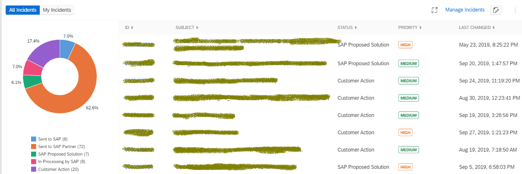 The incidents card is pure classic Fiori style with a pretty coloured graph to boot. Helpfully, the incidents are hyperlinked to the SAP Service website to get more details. You can toggle between your company’s incidents and your own individual incidents. The “Manage Incidents” hyperlink will also take you to the SAP Service support portal.