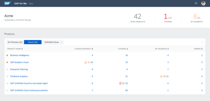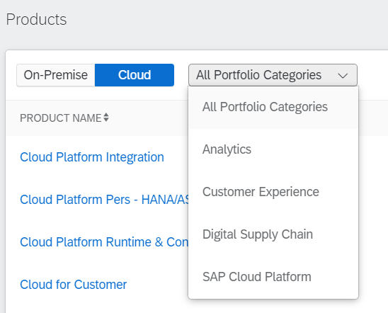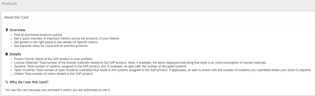 The “Products” card shows you the SAP products your company uses. These can be filtered by dropping down the “All Portfolio Categories”. You can also toggle between on-premise products and cloud products. You can also drill down into the product to see a whole barrage of further details including product related contacts (at your own company and at SAP).