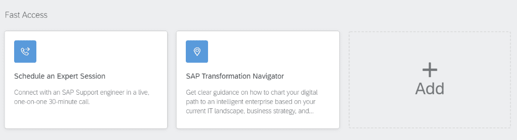 In true Fiori style, there is a favourites section at the bottom called “Fast Access” where you can add your own personalised apps by clicking on the “Add” button.