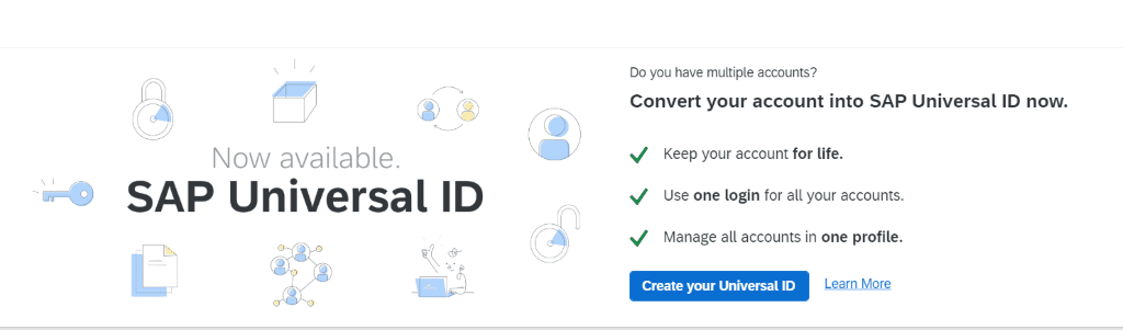 When clicking on the “My Accounts” link, SAP offers you the opportunity to convert your “S” number to a universal ID. This is intended to allow you to keep your ID throughout your career, regardless of the company you work for (as opposed to your “S” ID which is linked to a company). Despite the link stating that this is now available, at the time of writing, this has not yet been activated.