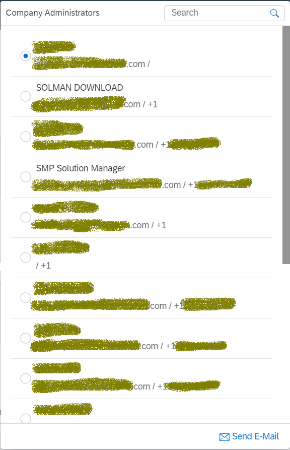Usefully, however, SAP recognises that the in-built security restrictions it assigned to the user may not be correct. Therefore, it gives you the option to contact one of your company administrators to allow the access (names in the example below have been erased for privacy).