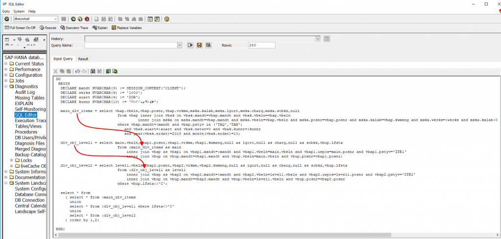 The local table variable dlv_obj_level1 is bound to SQL, which consumes table variable main_dlv_items in the FROM clause by joining it with subquery for level 1 items. In the same manner, the local table variable dlv_obj_level2 is bound to SQL, which consumes table variable dlv_obj_level1 in the FROM clause by joining it with subquery for level 2 items.