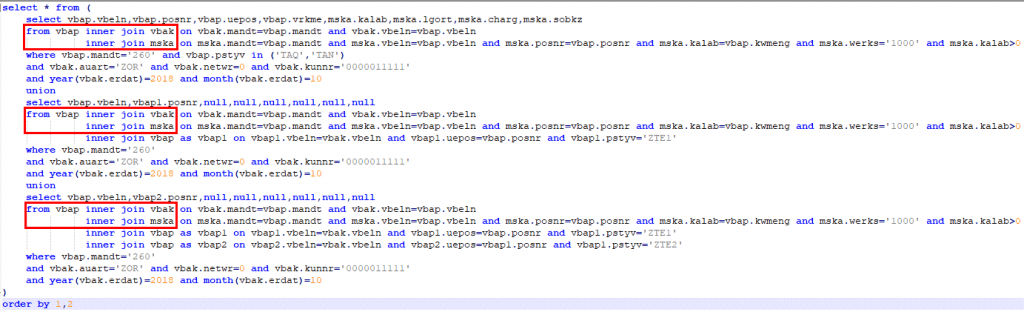 The local table variable main_dlv_items is bound to the select statement which returns sales order items on sales stock filtered for one particular sales order type and customer. The filtering is essential for reducing the amount of data as early as possible, especially before the Join operations.