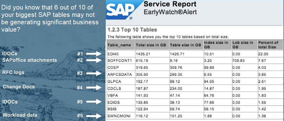 Whether you are already on SAP HANA or planning to move to HANA this question is important. According to Forrester research “Only 12-18% of all data in BW is actually used“. SAP BW systems generate high amounts of temporary data that lose value quickly after creation, but SAP ERP systems have these problems too. Often 6 out of the 10 biggest SAP ERP tables are not creating significant business value. See below the output of an SAP Early-watch report. Only 4 out of 10 biggest tables in this SAP ERP system contain transactional data that is directly needed to run this business. The rest of the data is important too, but should be purged from the system on a regular basis after end of purpose.