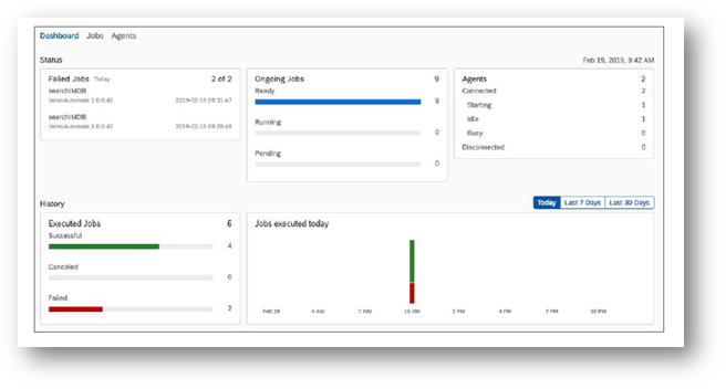 The Cloud Factory Monitoring Dashboard provides a snapshot of all the important information on the bots. It provides current status as well as the history of different bot executions. From the snapshot view, one can drill down to the lowest level possible. The status of failed/successful/cancelled jobs and much more information is available on the Dashboard. See exhibit - 8 below for a snapshot of the Cloud Factory Monitoring Dashboard.