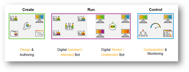 In summary, all the necessary tools for bot design, creation, process orchestration, testing, packaging, deployment and monitoring are provided. The following exhibit - 12, shows pictorially the same.