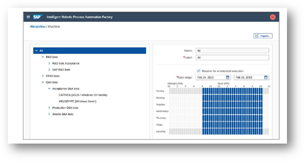 A structured set of machines and agents, which are responsible to run the bots, are defined in “Hierarchies”. You can assign and, allocate time windows, for Bots to run in “attended” or “unattended” modes. This can be done per Node or per Agent. This helps to schedule certain bots to run during night-time or non-peak hours as per the workload distribution in an organisation. A sample screen shot of a hierarchy can be seen in exhibit - 6 below: