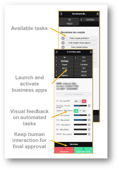 Operations such as clicking, navigating and manipulating data on the user screen are all performed by the Desktop agent. The desktop framework provides for creating overlay “user interface”, on top of the business application, on the screen. This is helpful in situations like, when it performs certain steps, collects data and presents it to the user for final “Go/No Go” answers. Refer to Exhibit - 4 below for a snapshot of the screen. It has the ability to inject UI elements such as Button or Label on top of business applications without modifying their code. Agent security is established at the time of registration to the Cloud Factory. Desktop and Cloud Factory are constantly connected using a secure WebSocket and necessary authentication is provided by Cloud Factory.