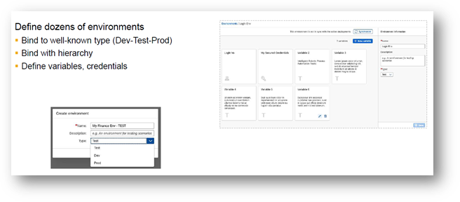 Information such as URLs, Credentials, variables and other such information is captured as part of “Environment”. In general, lots of information, which is specific to a given run time, is grouped under environment. An Environment is also bound to one of the SAP recommended “DEV” or “TEST” or “PROD” types. This helps to develop bots in a DEV environment and TEST in a test environment and deploy in “PROD” environment. There can be any number of environments that can be created as needed. The “Environment” is bound to a “Hierarchy”. This enables the hierarchy to derive the run time information from the linked environment. Refer to Exhibit - 7 below to see a screen shot of environment.