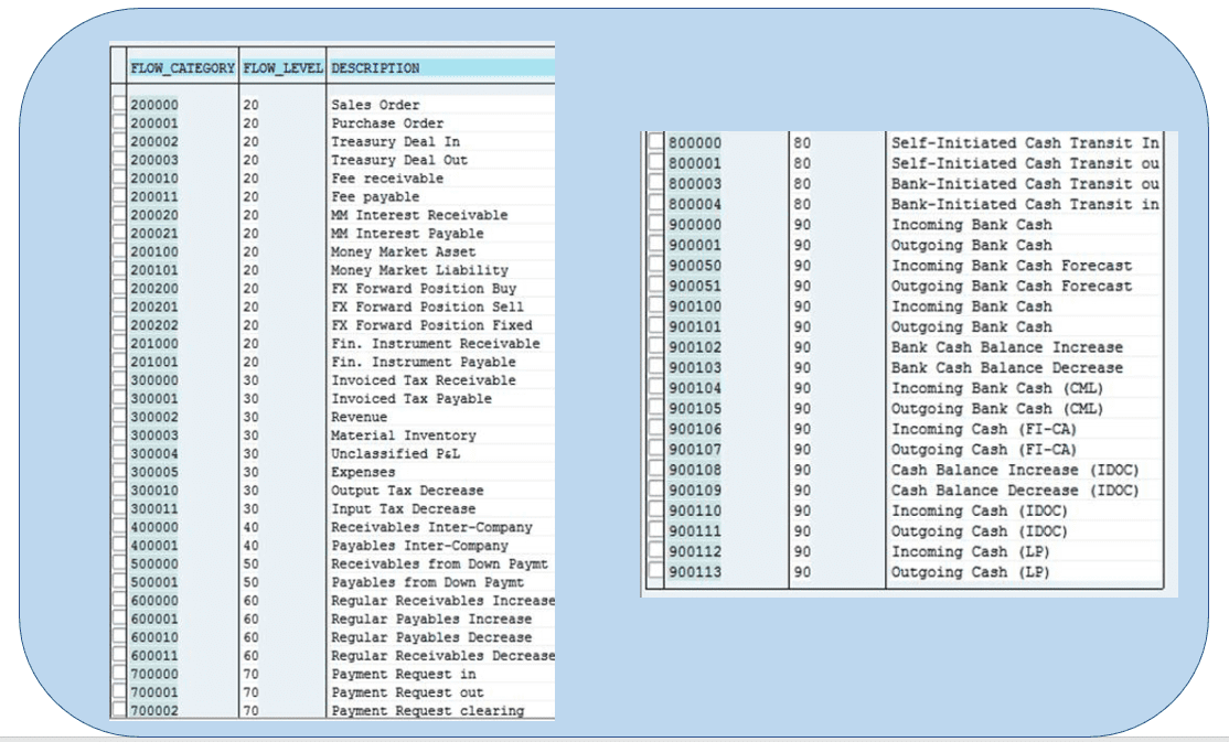 1. Flow type: Cash flow starts as forecast numbers first and then the actual cash flows happen. Flow types make this distinction and helps differentiate the forecast and actuals in Cash Operations and consequential statements.