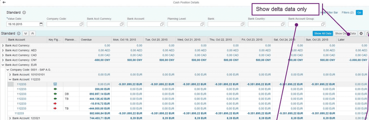There is a Cash Position summary app (Fiori ID: F1737), which shows cash amounts at a summary level in different views. Examples of the views are “By Company, By Currency” and such other views as mentioned above. There is also a cash position details app (Fiori ID: F0737), which shows details hierarchically. There is a default group hierarchy, defined in customizing, which is Bank Account Currency > Company Code > Bank Account. The days due are shown as Overdue (60 days before value date), Following 7 days from value date, Later (8 days and beyond from value date). This is shown in the sample screen shot in Exhibit - 3 below. There are hyperlinks available in the report at different data points such as Bank Account and Amount. The Cash Manager can click on them find further details if needs be.