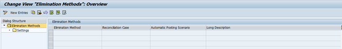 Elimination methods are to be defined for the reconciliation cases (based on SC_JOURNAL_ENTRIES_01 or SF_JOURNAL_ENTRIES_02 ). Elimination method connects a reconciliation case with elimination posting rules and can be assigned to a consolidation task.