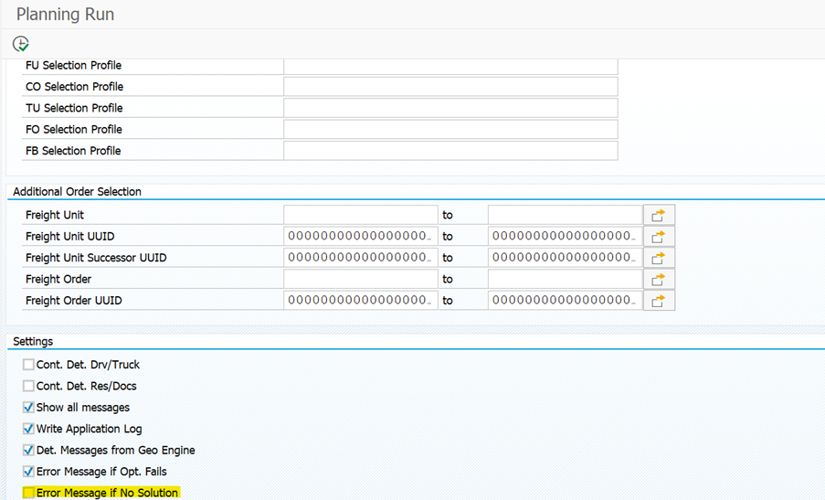 Earlier, when the planner did VSR planning and the parameters could not be found to execute the planning of freight unit, then the batch job for VSR planning would be cancelled. When no solution parameters were available/found and even in the spool no information was available, which led to a lot of time consuming troubleshooting on the issue. Now, based on the highlighted entry, the batch job has introduced a new parameter in the 2022 version. This led to distinguish error and no solution found. In this way, transparency and usability improved for the planner.