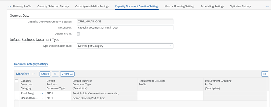 SAP introduced a new tab in the planning profile to create freight documents based on requirement grouping profile. The requirement grouping profile can be kept blank or one profile can be used for multiple capacity document categories. The requirement grouping profile is itself a new concept introduced by SAP whereby, based on various attributes like document type, source/destination location of stage, shipping condition, mode of transport etc based on which the requirement document (i.e. freight unit) can be grouped into freight document. Also, we can use incompatibility settings to define such groups.