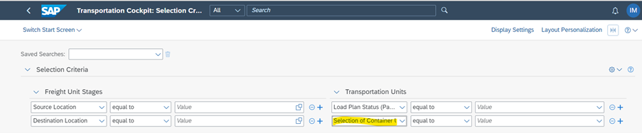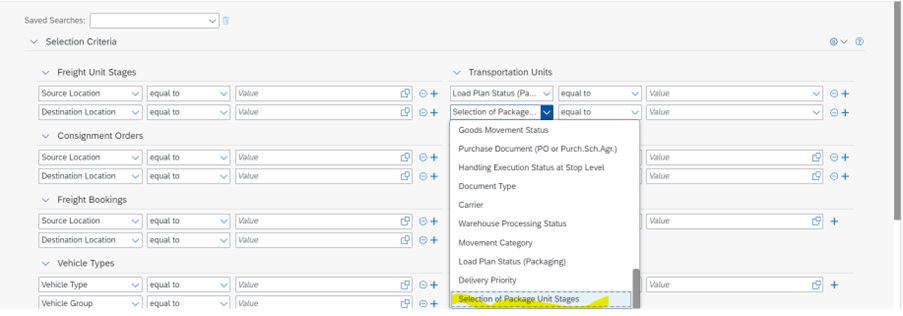 In the previous releases there were no provisions for business users to select container unit/packaging unit stages based on the load plan status. Now SAP has provided the option to select the stages and so have improved the usability of the stages in the selection criteria during the transportation planning process. The container unit/packaging unit stage is made available in the selection criteria of transportation cockpit and under “additional selection attributes” of selection profile.