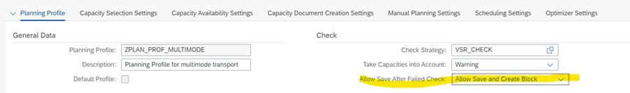 Now in the current release feature, in the planning profile we have new parameter (as highlighted below) in the check section. By default, the proposed value is “Allow save and create block” and alternative value is “Reject save”. As part of this, checks following are the checks which are available e.g. capacity check, resource check, etc.