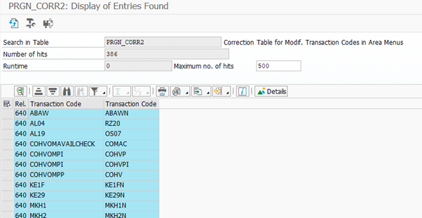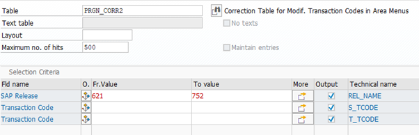 2. Add the “from” and “to” releases into table PRGN_CORR2 to see the replaced transaction codes – take a copy of all the transactions and send to the functional analysts to identify which ones are used.
