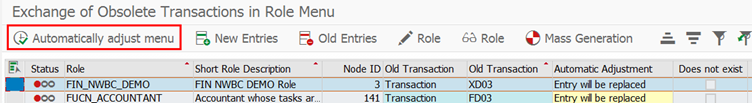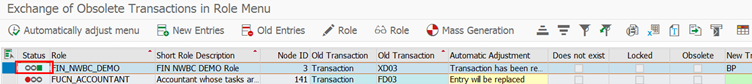 The entry is now amended so that the status is green to show that the role has been adjusted. In the background, SAP has removed the old transaction XD03 from the role and replaced it with the new transaction BP. The Automatic Adjustment column has changed from “Entry will be replaced” to “Transaction has been replaced”.