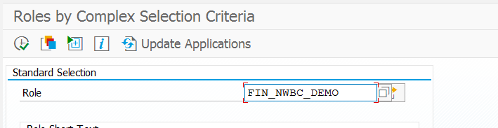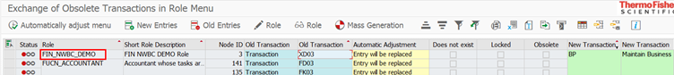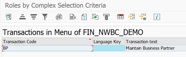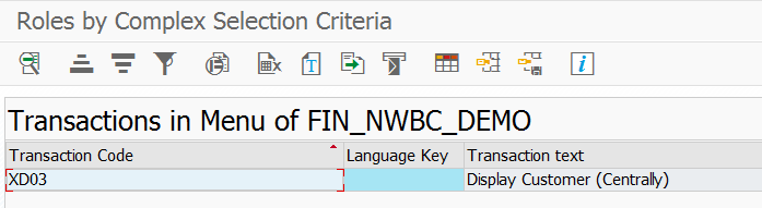 View the role first – in my example below, you can see that transaction XD03 is assigned to the role FIN_NWBC_DEMO, but that the XD03 transaction has been replaced by SAP transaction BP.