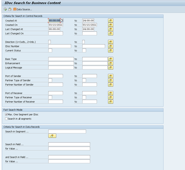 Example – if you want to see all IDOCs for a specific material number, you could add the material number into the “for Value” field. If you know the IDOC segment and/or the field name, you can add this in to make the search quicker.