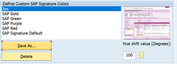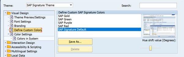 Here you can see that there are standard colours available – gold, green, purple, red. There is also SAP Signature Default. All these colours can be amended by shifting the “Hue shift value” left or right.