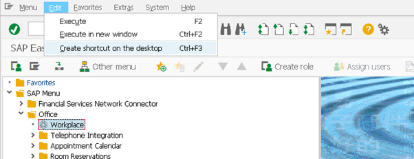 To do this, open an SAP session and click on the transaction in the menu path. Then select Edit>Create shortcut on the desktop (or simply click CTRL +F3).