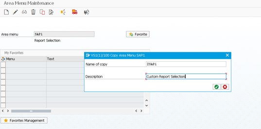 To do this, use transaction SE43 (this is a transportable workbench object). From here, you can add a new area menu or copy an existing one – screenshot below shows copying area menu SAP1 to ZSAP1.