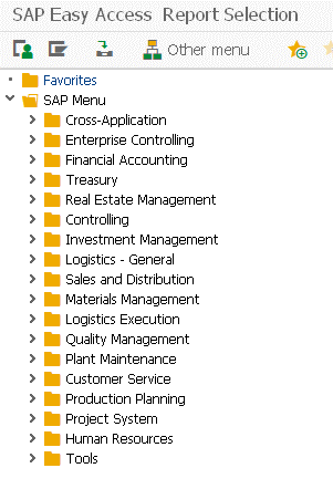 SAP provides multiple area menus depending upon the functional area. For example, transaction SAP1 will open up the area menu for SAP standard reports as below:
