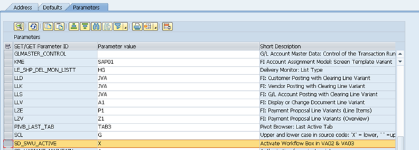 Now go to transaction SU3 and add parameter SD_SWU_ACTIVE with an “X” in the Parameters tab, as below:
