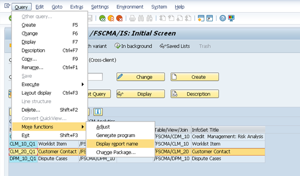 To do this, you need to get the report name for your query. Very simple: in SQ01, follow the menu path Query > More Functions > Display report name, as below: