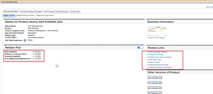 For example, if I select SAP S/4HANA 2023, I can see immediately the links to all the useful documentation, the release date of the version, and the end date for mainstream maintenance: