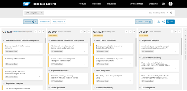 Once you click in the Search field, you can narrow your search down by SAP product. For example, I have chosen SAP Analytics Cloud. This then shows me all the innovations planned in the upcoming quarters for SAC: