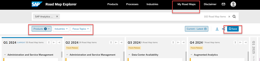 Once you have all your roadmap items you want (you can search by multiple products, industries and focused topics), you can then select the Save icon to add the results to your roadmaps. See below.